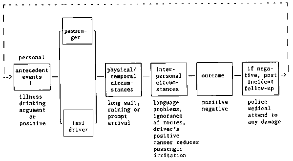 Each element of driver/passenger interaction warrants examination within an aggression reduction framework. The interactive process, graphically reproduced in the form of a flow chart at Figure 1, is helpful in this process. The approach has particular value in providing a framework for the systematic identification of possible reductive measures as well as for trainers faced with the task of explaining the nature of passenger aggression to student taxi drivers.