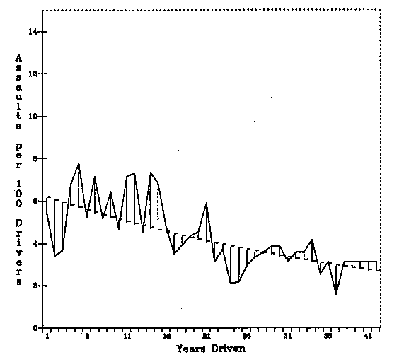 Drivers gain experience over time and most become adept at avoiding unpleasant experiences, including passenger aggression. Generally speaking, passenger aggression peaks during the first one or two years of a taxi driver's working life. The apparent decrease in both assaults and robberies shown at Chapter 6 over drivers' careers is partly due to the fact that some of the more aggression-prone drivers decide to discontinue driving taxis for a living. Some drivers, of course, gravitate to less hazardous day-time driving. Many do improve their customer service skills to the extent they experience less passenger aggression.